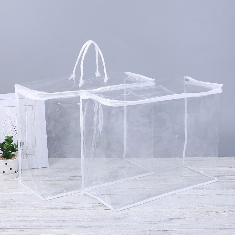 มีสองรูปแบบของกระเป๋าจัด PVC- หนึ่งอยู่กับที่จับและอื่น ๆ ไม่มีที่จับ มันสามารถใช้สำหรับการจัดเก็บรายวันที่บ้านหรือสินค้าบรรจุในร้านค้าหรือผลิตภัณฑ์ที่จัดขึ้นในโรงงาน คุณสามารถเห็นเนื้อหาภายในอย่างชัดเจนเนื่องจากกระเป๋ามีความโปร่งใส